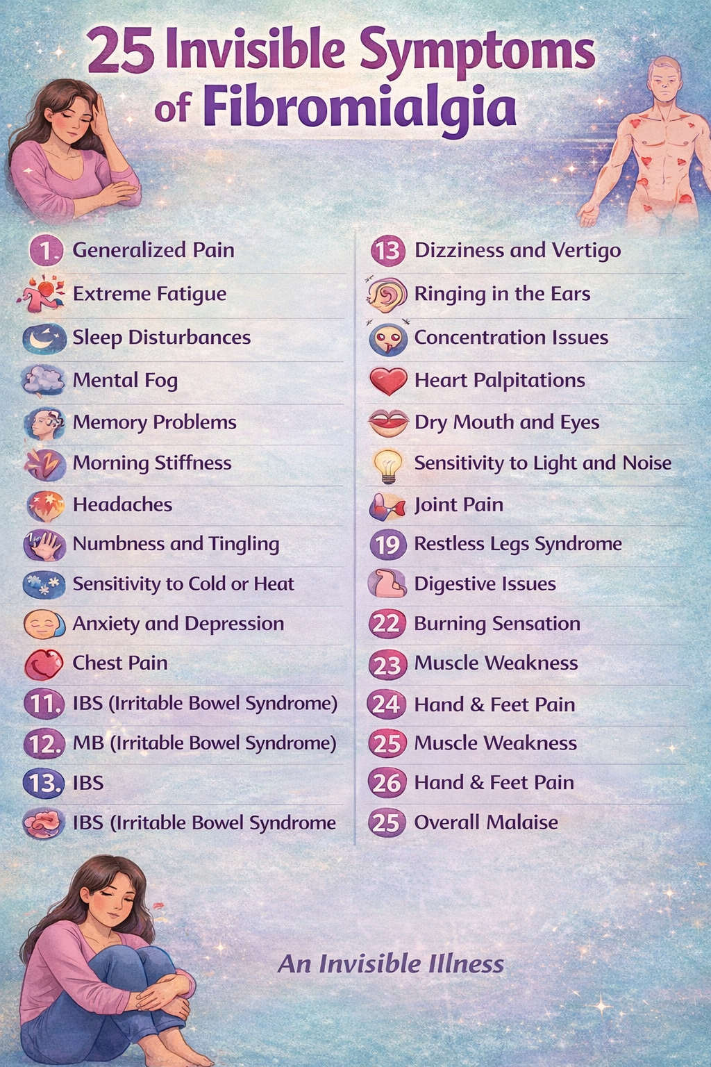 In this article, we’ll explore 25 invisible symptoms of fibromyalgia, explained one by one, to help patients, caregivers, and readers better understand how deeply this condition affects the body and mind.